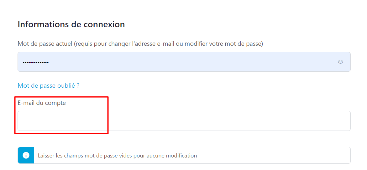 Ensuite, descendez un peu plus bas et insérez votre nouvel email dans "E-mail du compte"