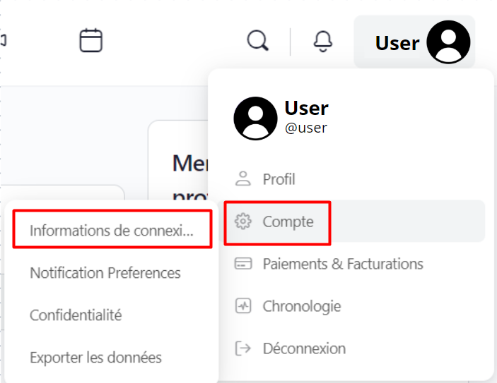 Une fois connecté, cliquez sur votre photo de profil ou votre nom en haut à droite de l’écran, puis sélectionnez "Compte" puis "Informations de connexion" dans le menu déroulant.