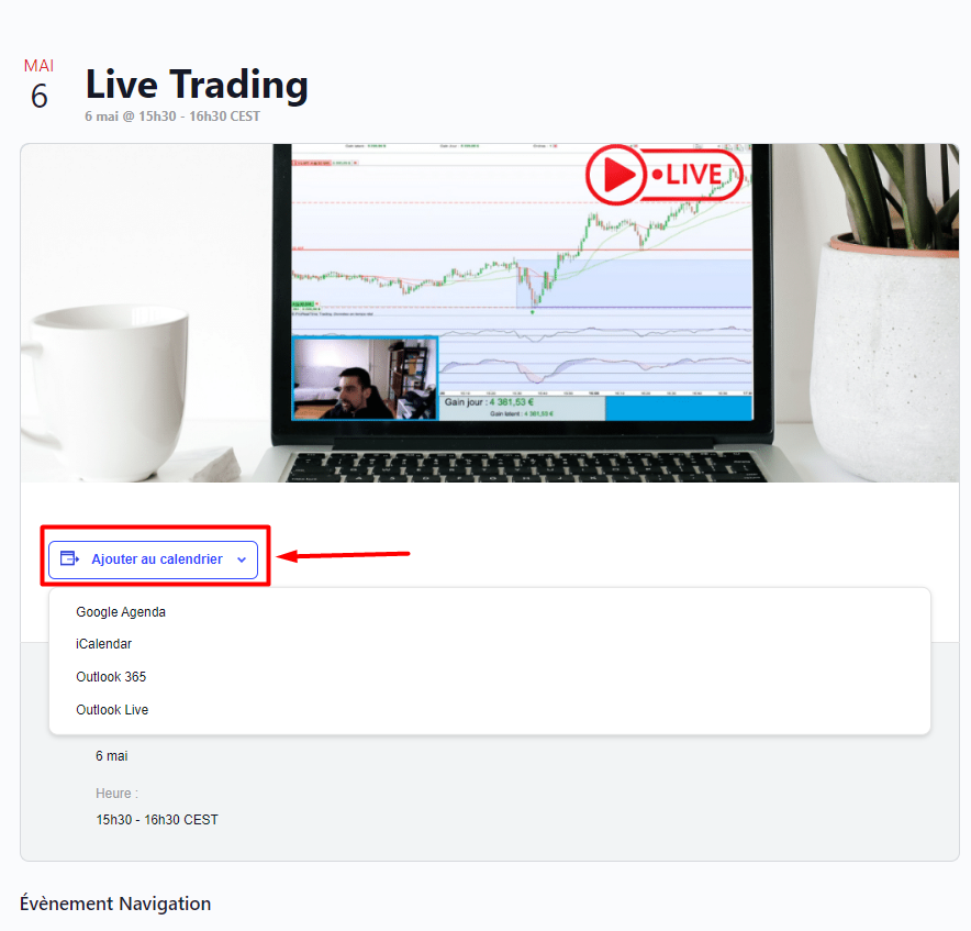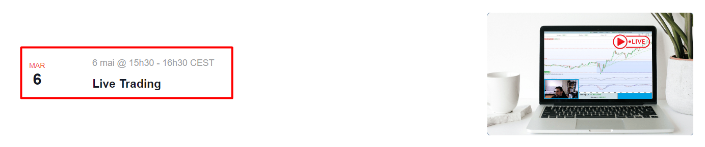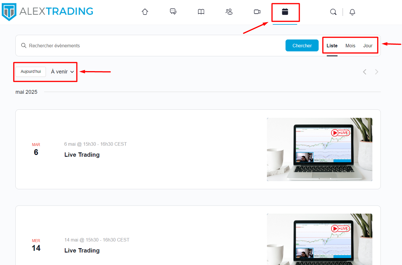 Vous souhaitez ne manquer aucun live de formation ou de session en direct sur la plateforme Alex Trading ? Tout se passe dans la rubrique "Événements". Voici comment consulter en quelques clics la liste des événements à venir :