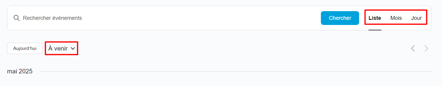 Par défaut, vous arrivez sur l’onglet "À venir", qui vous montre tous les événements programmés dans les jours ou semaines à venir.